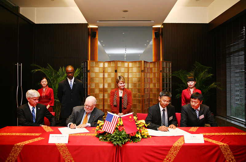 2013年9月11日晚6:10分,美國木霸克粉碎機公司與綠友集團的簽約儀式在北京洲際大飯店(金融街)水晶廳舉行。美國密西根州州長Rick Snyder(里克·斯奈德)先生及密西根州政府一行人,木霸克公司總裁James W. Shoemaker Jr. (詹姆斯·舒梅克)先生、木霸克公司市場營銷副總裁John Foote(約翰·富特)先生、木霸克公司國際銷售經(jīng)理Ryan Sanders(瑞安·桑德斯 )先生、Curt McMullen(科特·麥克姆倫)先生、綠友集團總裁李敏先生、副總裁劉軍先生、總裁助理和新先生參加了簽約儀式。