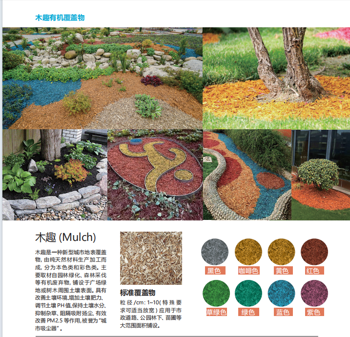 有機(jī)覆蓋物:是利用各種有機(jī)生物體材料,通過(guò)各種生產(chǎn)工藝,加工處理后鋪設(shè)于園藝植物或樹木周圍的土壤表面,起保持土壤水 分、吸附揚(yáng)塵、調(diào)節(jié)土壤溫度、增加土壤肥力、抑制雜草、促進(jìn)植栽生長(zhǎng)、減少土壤侵蝕和緊實(shí)度以及裝飾美觀等等作用。(如下圖)
