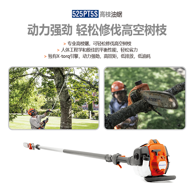 為專業(yè)用戶而設計,富世華525PT5S配備延長桿,可以清除高空樹枝,人體工程學和平衡性助您以輕松的方式完成任務。操作簡便,X-Torq?引擎保證強勁動力,高扭矩,低排放和低油耗。