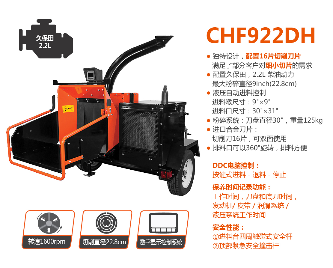 老熊(BEARCAT)品牌樹枝粉碎機(jī),配置久保田2.2L柴油機(jī),動(dòng)力更強(qiáng)勁,最大可切削直徑23cm樹枝;智能液壓進(jìn)料系統(tǒng)可自動(dòng)監(jiān)控發(fā)動(dòng)機(jī)轉(zhuǎn)速和進(jìn)料狀態(tài),根據(jù)進(jìn)料負(fù)荷的大小自動(dòng)調(diào)整進(jìn)退料;噴料口可360度旋轉(zhuǎn),隨意選擇噴料方向;切削刀片經(jīng)過特殊處理,堅(jiān)固耐用并可多次修磨。