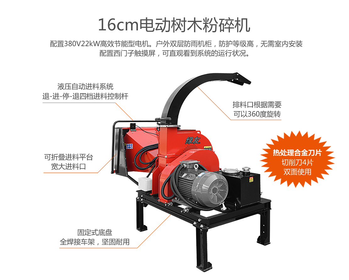 16cm電動(dòng)粉碎機(jī),配置380V22kW高效節(jié)能型電機(jī)。戶外雙層防雨機(jī)柜,防護(hù)等級(jí)高,無需室內(nèi)安裝;配置西門子觸摸屏,可直觀看到系統(tǒng)的運(yùn)行狀況。