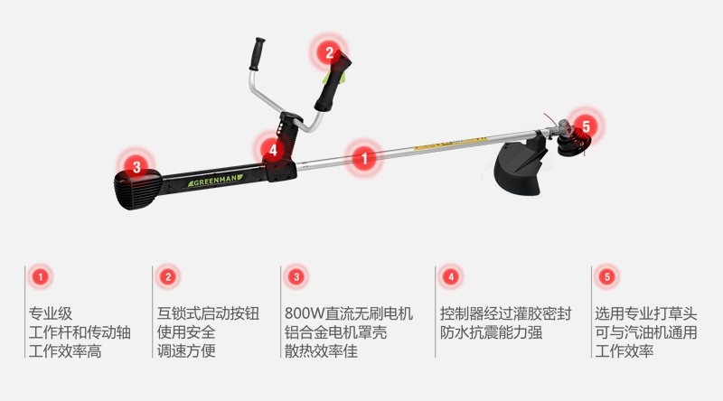 GREENMAN 電動(dòng)割灌割草機(jī)從國(guó)內(nèi)綠化管理的實(shí)際情況出發(fā),選用800W大功率直流無(wú)刷電機(jī)和大直徑打草繩。在實(shí)現(xiàn)電動(dòng)化的同時(shí),又能滿足綠化養(yǎng)護(hù)的高效率。